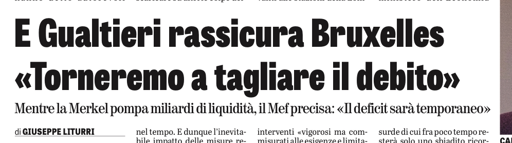 Ché se  poi vi pare che questo sai un discorso da  bigotti senza contatto con la realtà, riporto due commenti a proposito della chiusura anche economica che è stata decretata per l’Italia, senza paracadute alcuno. Perché la UE vuole che tagliamo il debito anche adesso, e  Gualtieri  la rassicura :