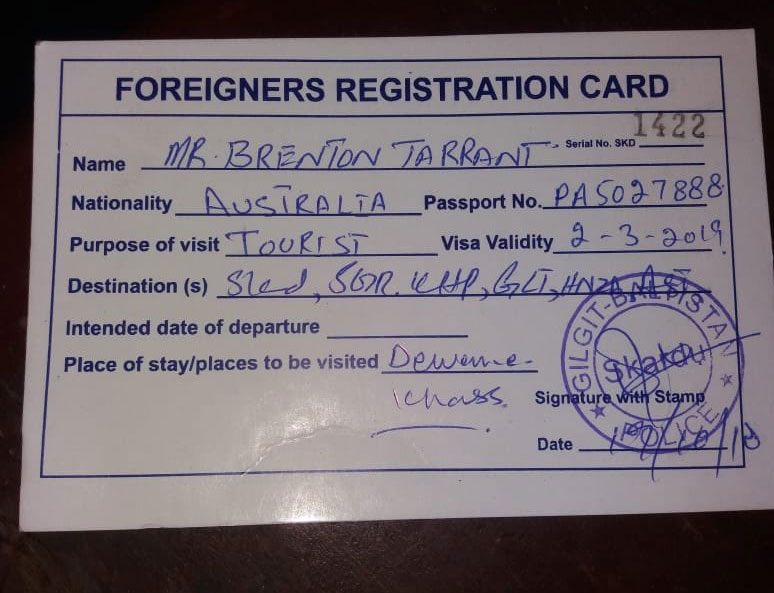 Una albergatore se lo ricorda: “Syed Israr Hussain, proprietario di Osho Thang Hotel a Minapin Nagar, ha dichiarato all’AFP: “(Tarrant) … è rimasto per due giorni prima di partire per Khunjerab (Pass, al confine con la Cina). Era un tipo decente e tranquillo.”