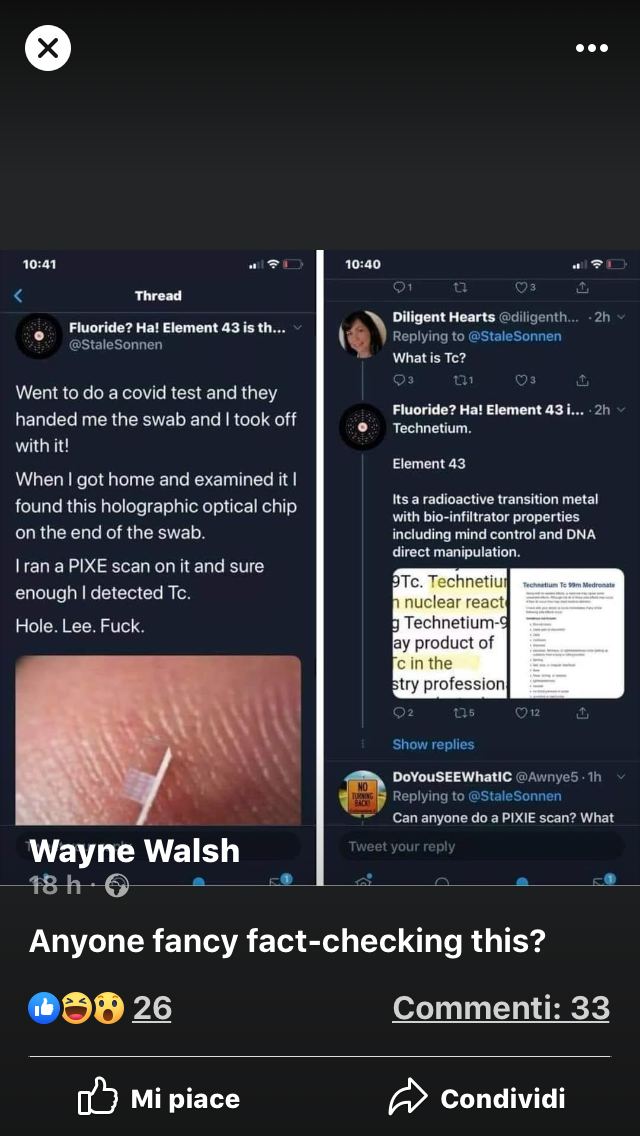 TC è il tecnezio, metallo radioattivo di transizione (dal decadimento dell’Uranio), peso atomico 43, usato effettivamente come radiofarmaco rilevatore. Siccome è raro e (immagino) costoso, ho qualche dubbio che venga inserito di routine in milioni di tamponi.
