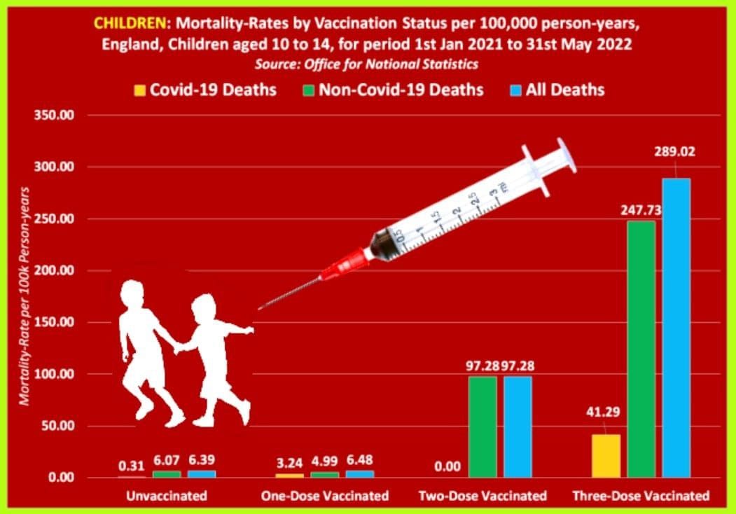 Tasso di mortalità per stato di vaccinazione, Inghilterra, bambini dai 10 ai 14 anni.