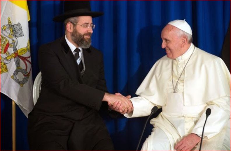 Nella foto in alto: Il Papa Bergoglio incontra il rabbino capo, David Lau nel corso della visita in Terrasanta (da notare il particolare della Croce tenuta nascosta, un caso? ).