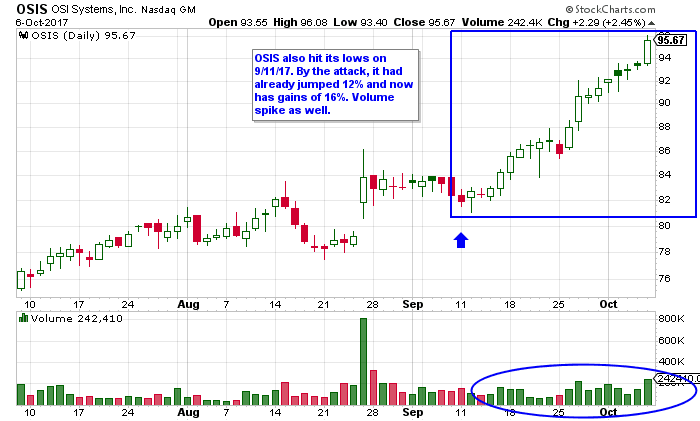 Le azioni della OSI Systems, leader mondiale nei macchinari del controllo-bagagli e persone negli aeroporti di tutto il pianeta (un business miliardario globale, dopo l’11 Settembre che hanno reso obbligatori quei macchinari), sono salite giorni prima. Precisamente hanno cominciato a salire dall’11 settembre, con aumento del volume delle share/options. Da quel giorno fino alla strage, l’OSI ha guadagnato il 16%.