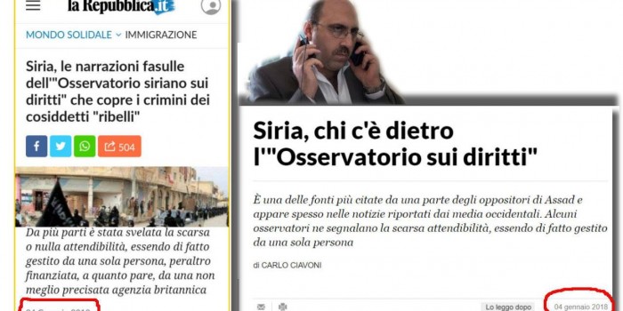 A  firma di Carlo Ciavoni, l’articolo  rivela , per la prima volta su Repubblica,  “la   scarsa o nulla attendibilità  dell’Osservatorio Siriano dei diritti umani,  essendo di fatto gestito da una sola persona, peraltro finanziata, a quanto pare, da una non meglio precisata agenzia britannica”  (Abdel Rahman, un fuoriuscito anti-Assad che scrive da Coventry e in Siria non è entrato da  17 anni) , che fornisce da sei anni  notizie e cifre sulle vittime civili uccise dall’esercito siriano regolare  e dall’aviazione russa, notizie che vengono accettate come oro colato dai grandi media.