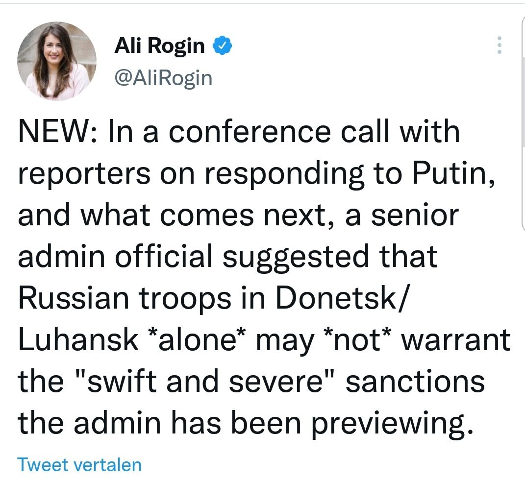 Il portavoce di Biden in conferenza stampa proprio ora ha rifiutato di definire l’evento una invasione, osservando che le truppe russe sono state nel Donbas per anni. Né i “peacekeeper” attiveranno il pacchetto completo di sanzioni, ma il funzionario ha avvertito di nuove sanzioni domani.