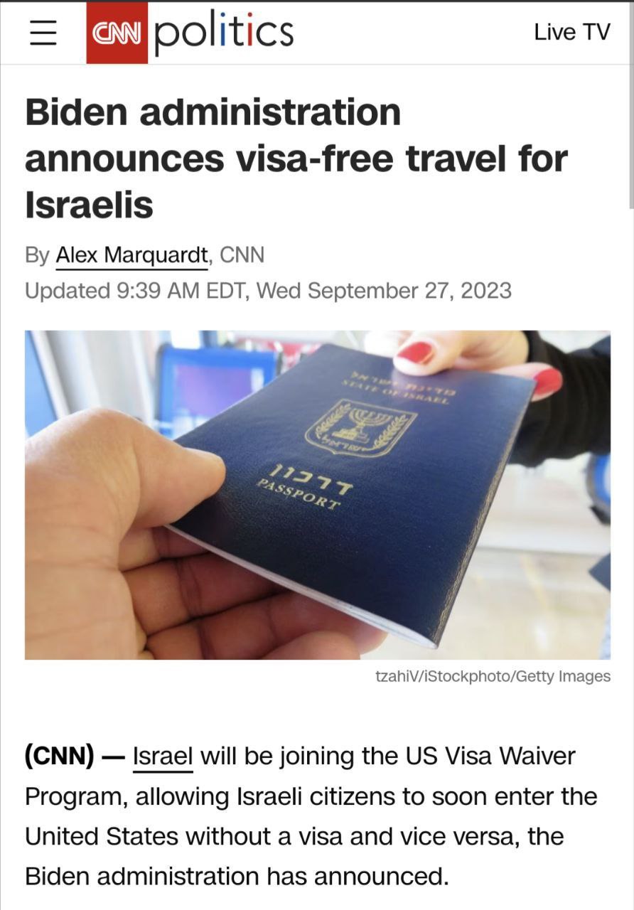 Dieci giorni prima dell’invasione di Hamas, Biden aveva annunciato che agli israeliani sarebbe stato consentito di entrare negli USA senza il visto.