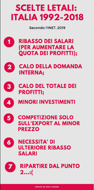 Si è però così innescato un circolo vizioso, che sta strangolando l’economia italiana in assenza di interventi di rottura: la riduzione degli stipendi, inizialmente una scelta per aumentare la quota in favore dei profitti(seppure limitata alle classi dominanti), è diventata una ineluttabilità per tutti.