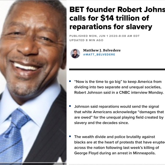 Sardonico, il ricchissimo negro Robert Johnson ha proposto al candidato Joe Biden: se vuoi i voti di noi negri, devi impegnarti a versare 14 trilioni ai 40 milioni di neri che abitano qui, come risarcimento per la schiavitù e il “privilegio bianco” di cui ci avete fato soffrire.