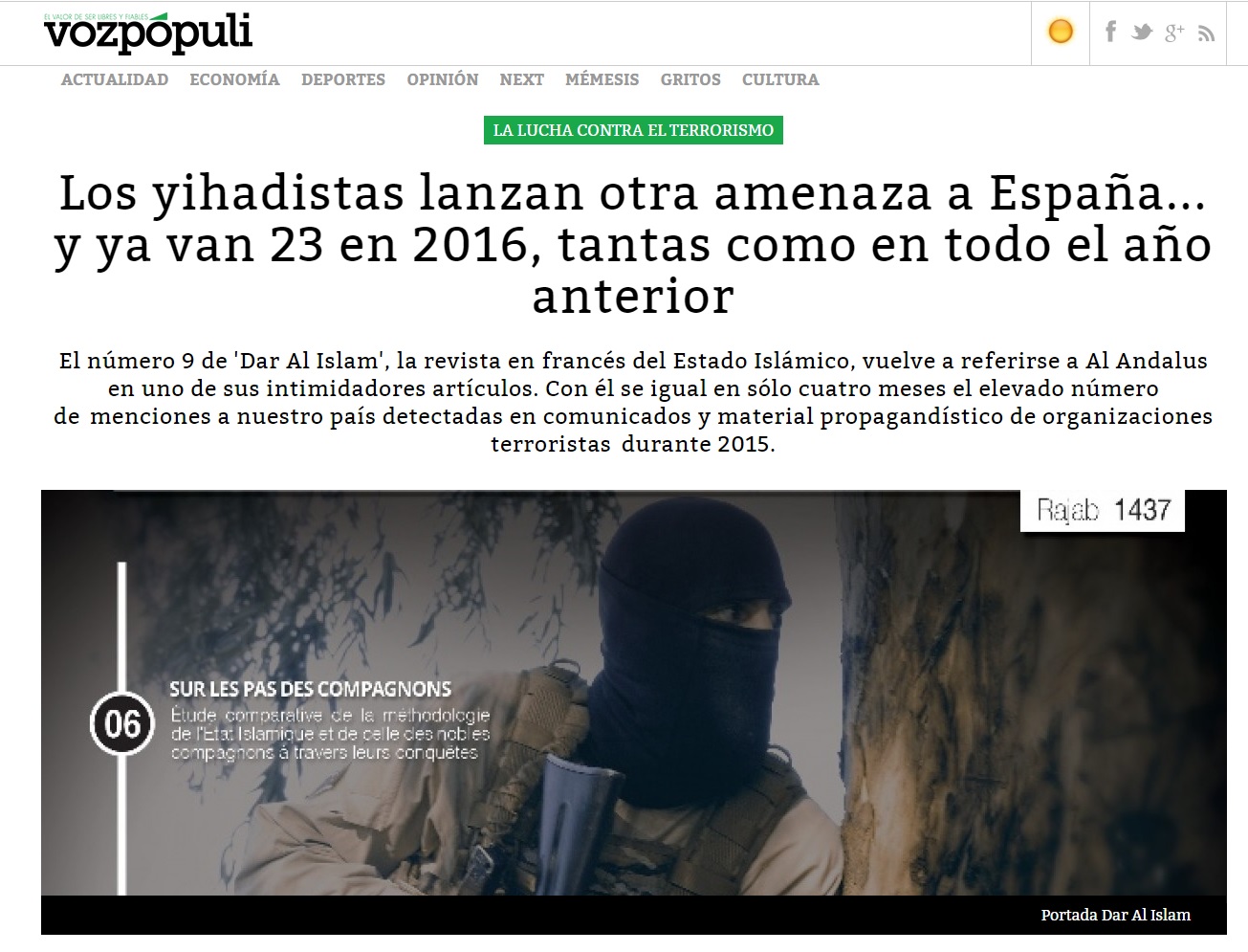 Voz Populi, 28 aprile 2016: “I Jihadisti lanciano altre monacce alla Spagna – Il numero 9 di Dar Al Islam, la rivista francese dello Stato Islamico, torna a riferirsi a Al Andalus – elevato il numero di menzioni del nostro paese scoperte nei comunicati e materiale propagandistico”..