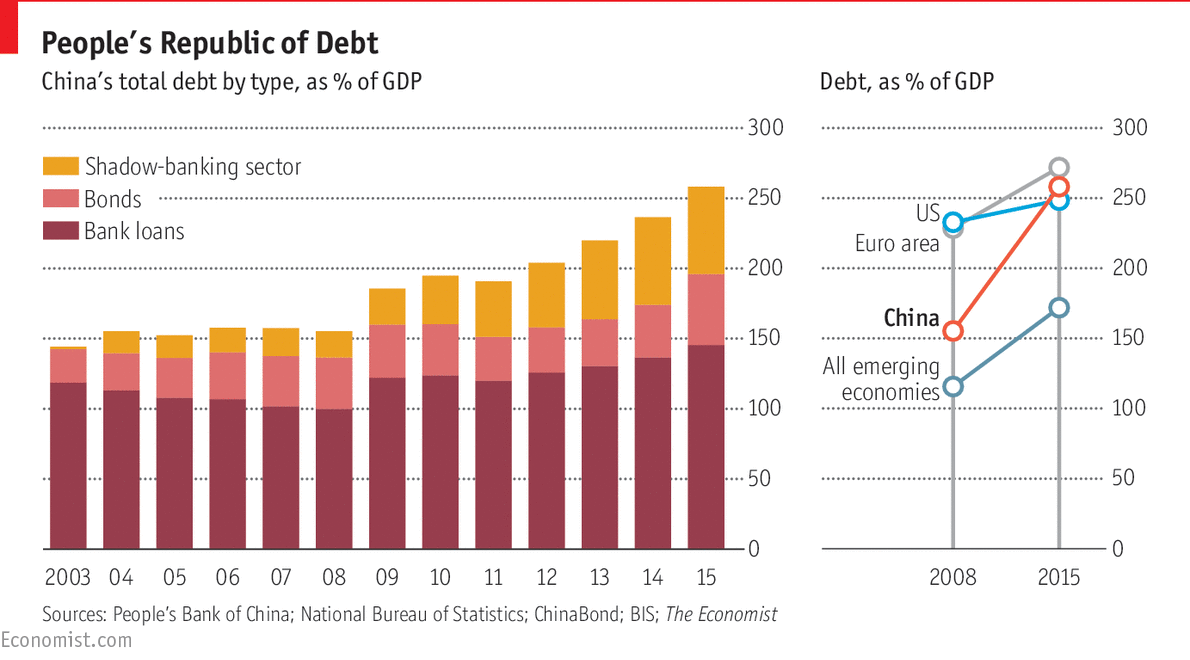 Interessante la situazione della Cina, descritta in poche semplici cifre: dal 2008, il peso dei debiti del (gigantesco) paese è passato dal 150 al 260 del Pil; i prestiti in sofferenza sono al 5,5% – che sarebbe invidiabile per noi, senonché in Cina sono raddoppiati in 2 anni. Soprattutto, “gli attivi delle banche cinesi ammontano oggi a 30 mila miliardi di dollari, ossia il 40% de PIL mondiale”. Leggete bene: non il 40% del Pil nazionale, ma planetario. Le banche cinesi hanno prestato alle industrie cinesi (questo son gli “attivi”: prestiti, esposizioni) quasi la metà del Pil mondiale. Inoltre, la finanza “oscura” (una fungaia di crediti e speculazioni paralleli, che sfugge alle regole) è quadruplicata in 3 anni. L’autore trae qualche consolazione dal fatto che l’economia cinese non è così interconnessa come le altre.