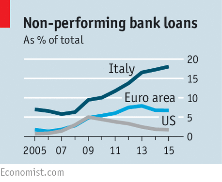 L’Italia inquieta i mercati da mesi, dal collasso di Montepaschi, per le sue banche malmesse e con più del 18% di crediti andati a male, e (ma cortesemente Herblay non gira il coltello nella piaga) governate da criminali truffatori con l’aggravante di essere incompetenti, “che vogliono farvi credere che è tutta colpa della crisi economica se ci sono le sofferenze e che regolatori e vigilanza in Italia non c’entrano nulla” (qui ho rubato una riga a IcebergFinanza), mentre hanno truffato i risparmiatori rifilando loro dei titoli-kakka. I banchieri italioti hanno messo insieme un fondo, Atlante, per aiutare le banche in difficoltà: che dopo averne aiutato una, la Banca Popolare di Vicenza, ha già quasi finito i soldi. In un paese il cui debito pubblico supera i 2 mila miliardi di euro – ma Herblay, caritatevolmente, cita “tutte le restrizioni della UE, che sono altrettante complicazioni per aggiustare la crisi bancaria italiana. D’accordo, lo sappiamo.