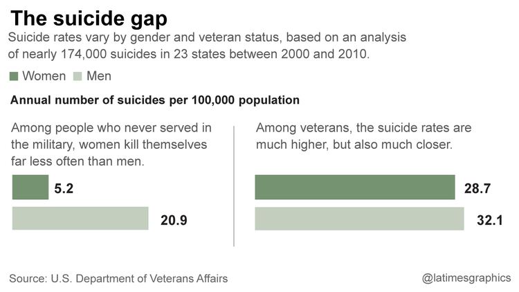 Una indagine statistica del governo Usa ha scoperto che le donne-soldato, reduci dalle guerre, si suicidano ad un tasso sei volte superiore alla popolazione femminile generale; e tra le soldatesse giovani (18-25 anni), il taso di seuicidi è 12 volte più alto.