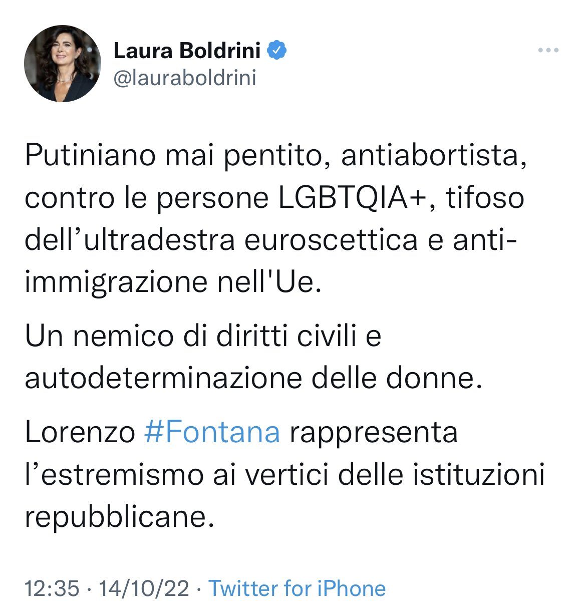 E tutta questa rabbia da idrofobi per essere stato eletto, il Fontana, a una carica notarile come è quella di Presidente della Camera: deve sorvegliare il rispetto del regolamento, applicare le regole oggettive del condominio. Su quella poltrona, Fontana non ha alcun potere di realizzare i suoi propositi “contro Lgbt, aborto, eutanasia e Peppa Pig” – Anzi, la carica è in senso forte “neutralizzante” delle idee politichesi di chi la ricopre, come dimostrano le precedenti, dalla Boldrini a Casini a Bertinotti.