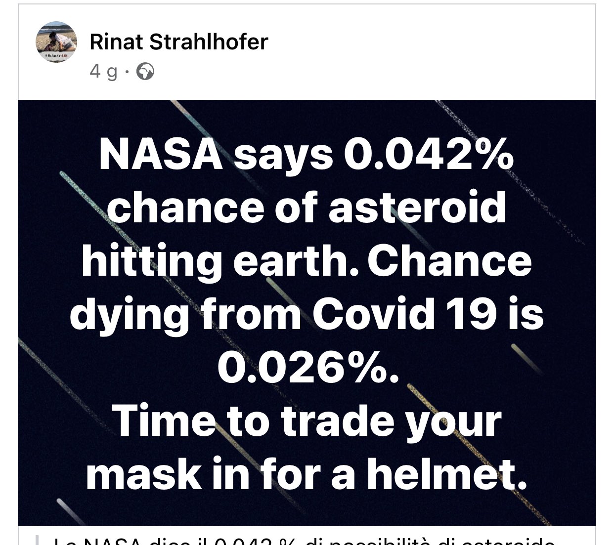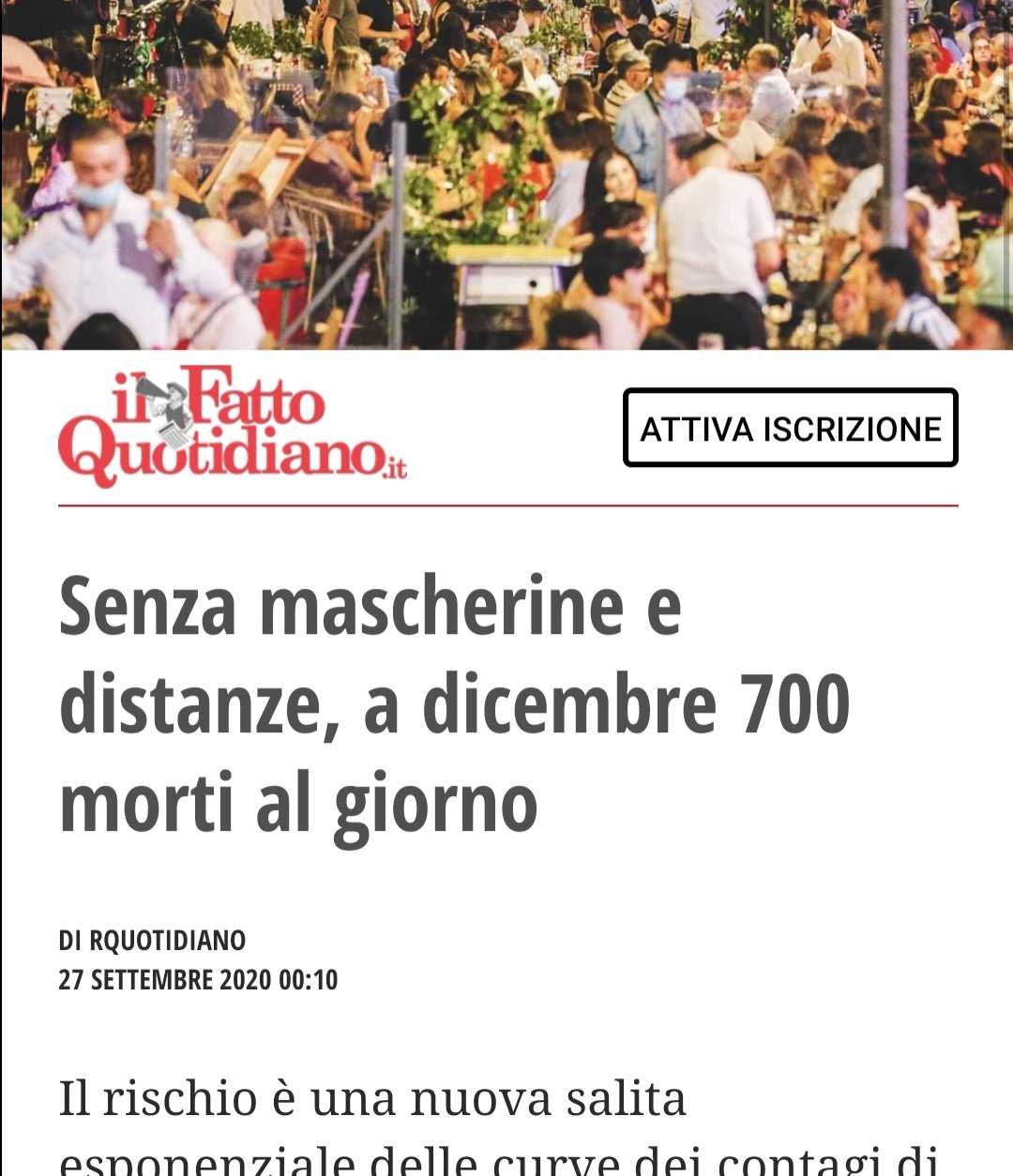 “Non volete un nuovo #lockdown? Bene, nessuno lo vuole. E allora rispettate le tre fottute regole: -Mascherina (con il fottuto naso dentro) -Distanziamento -Lavarsi le mani (ma anche il resto) Non è difficil” (Charlotte Matteini)