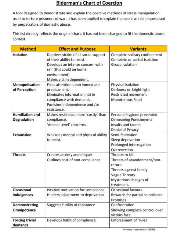 “Negli anni Cinquanta, lo psicologo Albert Biderman sviluppò un modello descrittivo detto “Diagramma di Biderman”: uno strumento che illustra i metodi coercitivi della pressione manipolatoria esercitata sui prigionieri di guerra, e non solo: anche dai capi delle sette “religiose” e persino dai perpetratori di abusi domestici. Lo scopo è distruggere la volontà degli assoggettati ed esercitare il controllo mentale totale”.