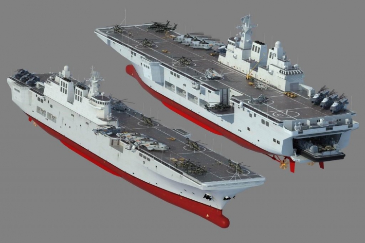 Nei cantieri navali dei cantieri Hudong Zhonghua di Shanghai, sta costruendo grande mezzo navale da sbarco (nel gergo americano LPD Landing Platform Dock), come rivelato da foto satellitari del febbraio scorso. Scafo prefabbricato, il mezzo – Tipo 075 – sarà il più grande mezzo anfibio della Marina Popolare: con lo stesso dislocamento, sopra le 40 mila tonnellate, della porta-elicotteri da sbarco americana LHD (Landing Helicopter Dock) d’assalto polivalente – per confronto, il Mistral francese disloca la metà.