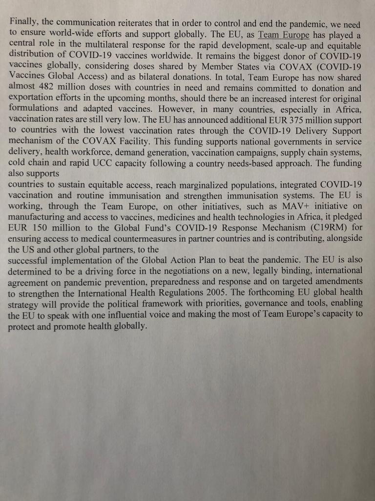 “L’UE è inoltre determinata a svolgere un ruolo guida nei negoziati per un nuovo accordo internazionale giuridicamente vincolante sulla prevenzione, la preparazione e la risposta alle pandemie e modifiche mirate per rafforzare i regolamenti sanitari internazionali”.