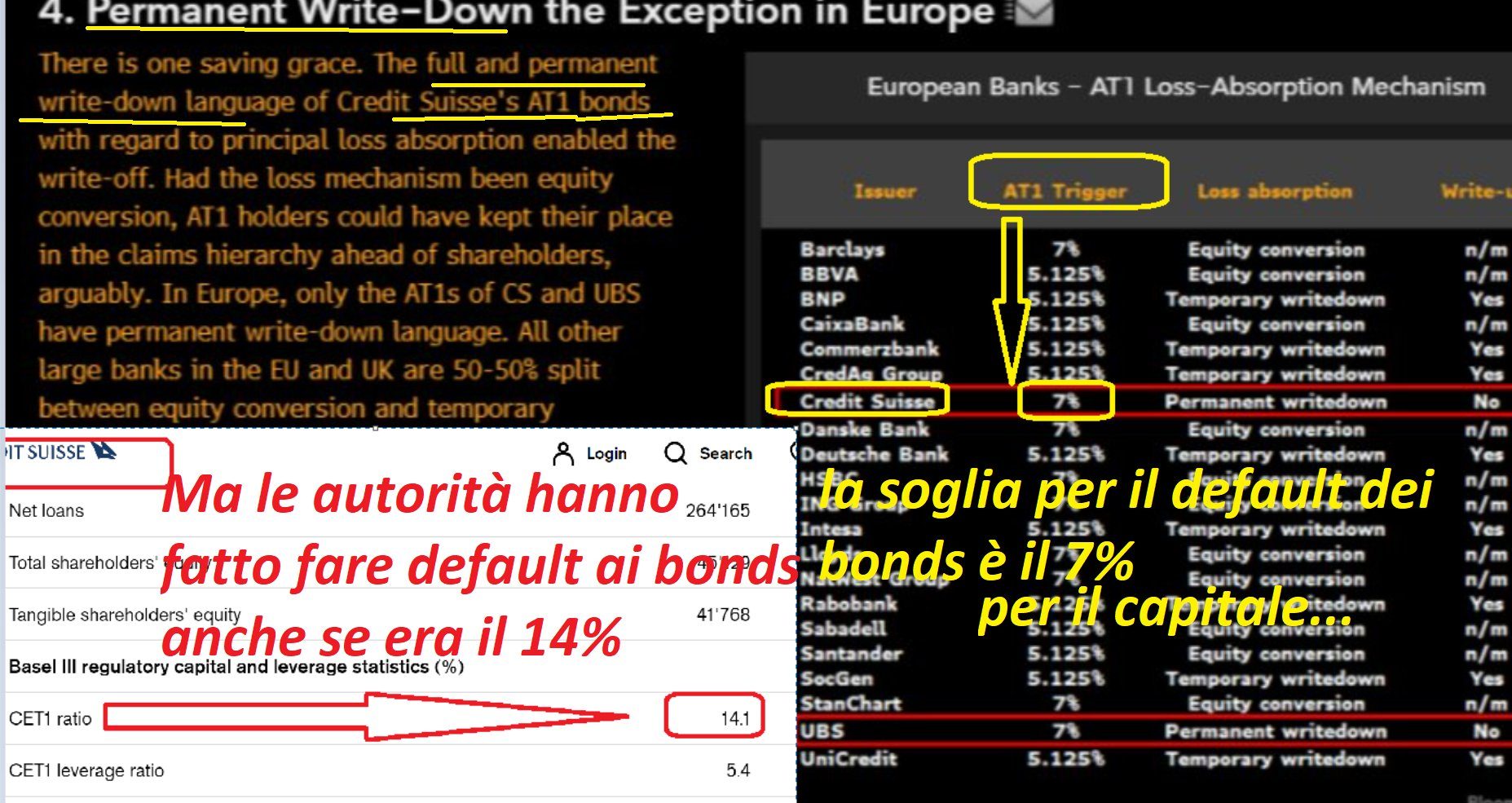 Quale è la regola per dichiare i bonds bancari (AT1) in default ? Il capitale della banca calato al 7% (del bilancio…).