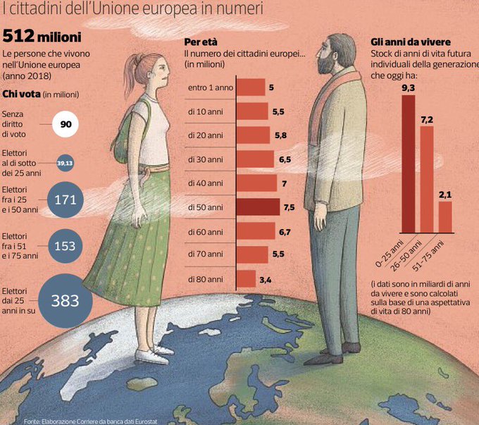 Ma è giusto che uno voto valga un voto in un tema di lunga lena come il clima (o il debito, o il cambio tecnologico)? La generazione degli 0-25enni in Europa oggi ha un patrimonio di vita futura di oltre 9 milioni di anni. Più di tutte le altre generazioni adulte messe insieme
