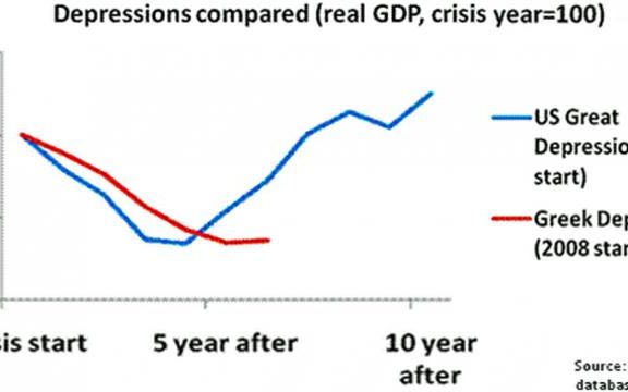 Che compara la depressione in corso in Grecia con quella che soffrirono gli Stati Uniti nel 1929-39. La depressione in Grecia è peggiore, più profonda e mortale di quella di allora; ancor peggio, mentre negli Usa a cinque anni dalla crisi si notò un lento risalire, a Grecia affonda e affonda. Non può salvarsi, ha spiegato King: