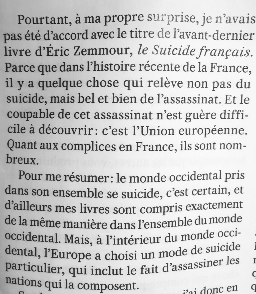 Come ha notato Michel Houellebcq: “Nella storia recente di Francia, c’è qualcosa che appare non un suicidio, ma vero assassinio. E l’autore di questo assassinio non è difficile da scoprire: è l’Unione Europea. Il mondo occidentale, nel suo insieme, si suicida; ma all’interno del mondo occidentale, l’Europa ha scelto un modo di suicidio particolare, che comprende il fatto di assassinare le nazioni che la compongono”.