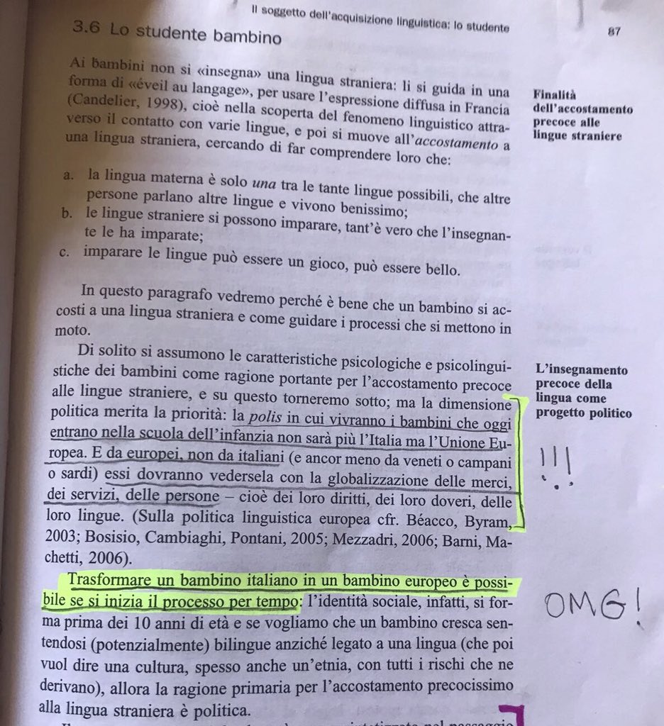 L’Unione Europea e i suoi mantenuti sono, apertamente, parte di questo progetto di distruzione morale. Ludivine Richecoeur, insegnante di lingue a Roma ed attivista politica, ha riportato in un suo tweet questo passo di un manuale di formazione per gli insegnanti di lingue estere: “Le sfide di Babele, insegnare le lingue nelle società complesse”, autore Paolo Balboni