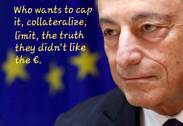 Un qualunque limite o tetto farebbe immediatamente sì che gli euro circolanti in Italia o Spagna varrebbero meno degli euro circolanti in Germania o Olanda. Lo Stato italiano dovrebbe immediatamente reagire alla fuga di capitali che avverrebbe istantaneamente, rimettendo in vigore il reato di esportazione dei capitali – sarebbe il primo passo versa la re- istituzione della propria moneta, per pura necessità.