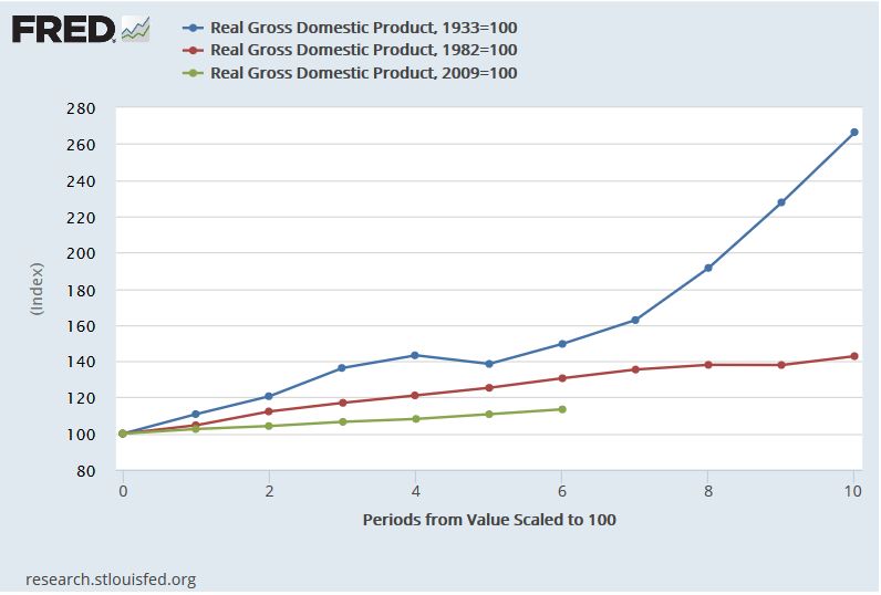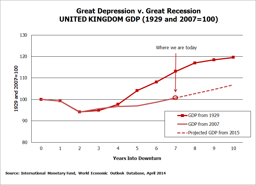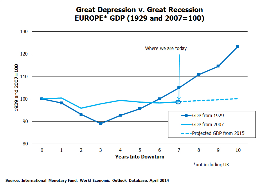 Questa tabella mostra che negli annni ’30, dopo il quarto anno di crisi, l’Europa conobbe un aumento del PIL (GDP), un notevole miglioramento. Nella crisi odierna, nessun aumento dl Pil.