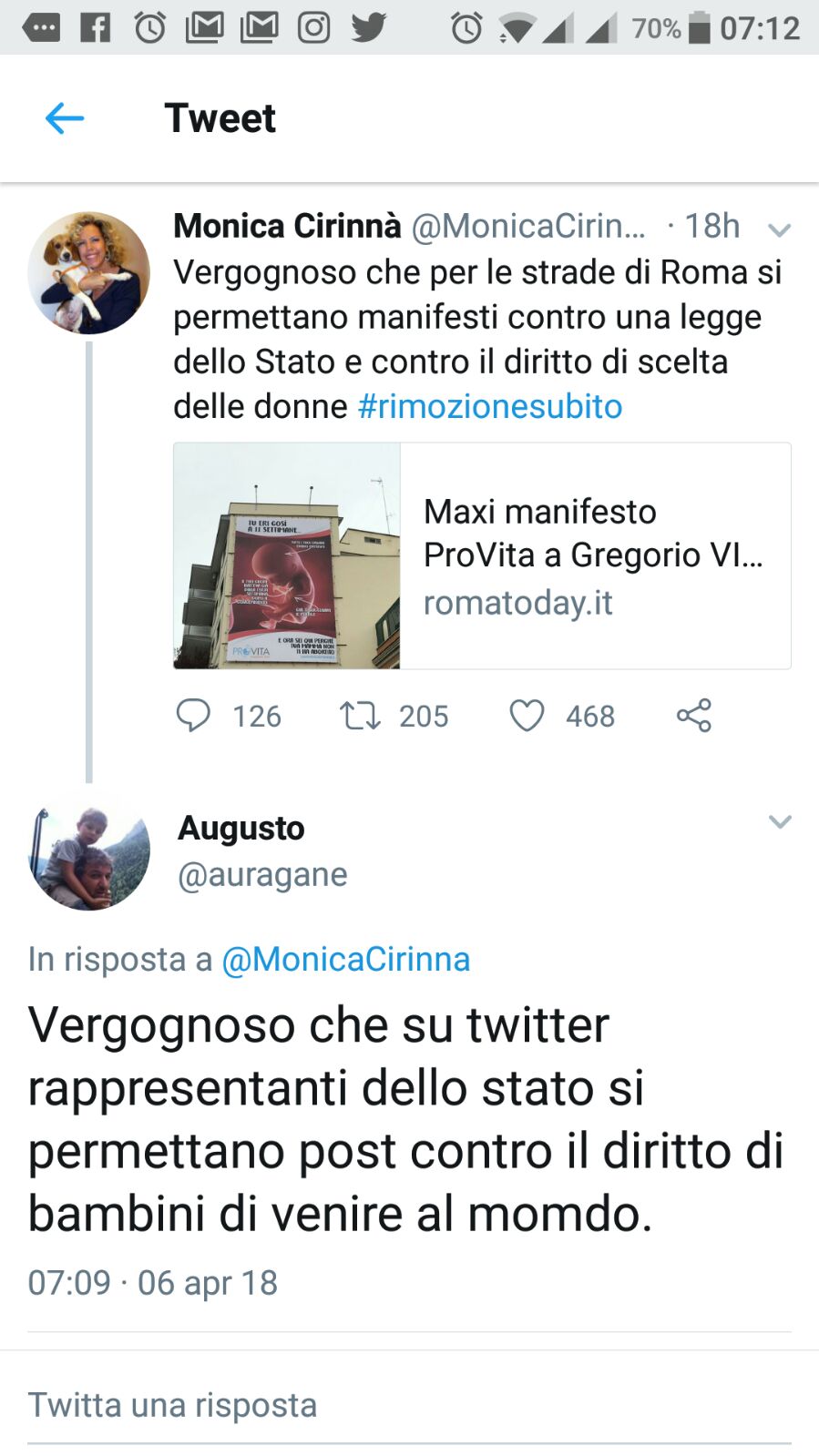 Il manifesto era esposto a Roma sulla frequentatissima via Gregorio VII da Pro Vita Onlus, che parteciperà alla conferenza stampa di mercoledì prossimo. Il manifesto nel frattempo è stato rimosso, come annuncia l’Associazione Vita di Donna Onlus. Dopo che alcune esponenti locali del PD avevano protestato, e che la senatrice Monica Cirinnà aveva lanciato su Twitter l’hastag #rimozionesubito mentre sulla pagina Fb aveva pubblicato il seguente post: “Vergognoso che per le strade di Roma si permettano manifesti contro una legge dello Stato e contro il diritto di scelta delle donne”.