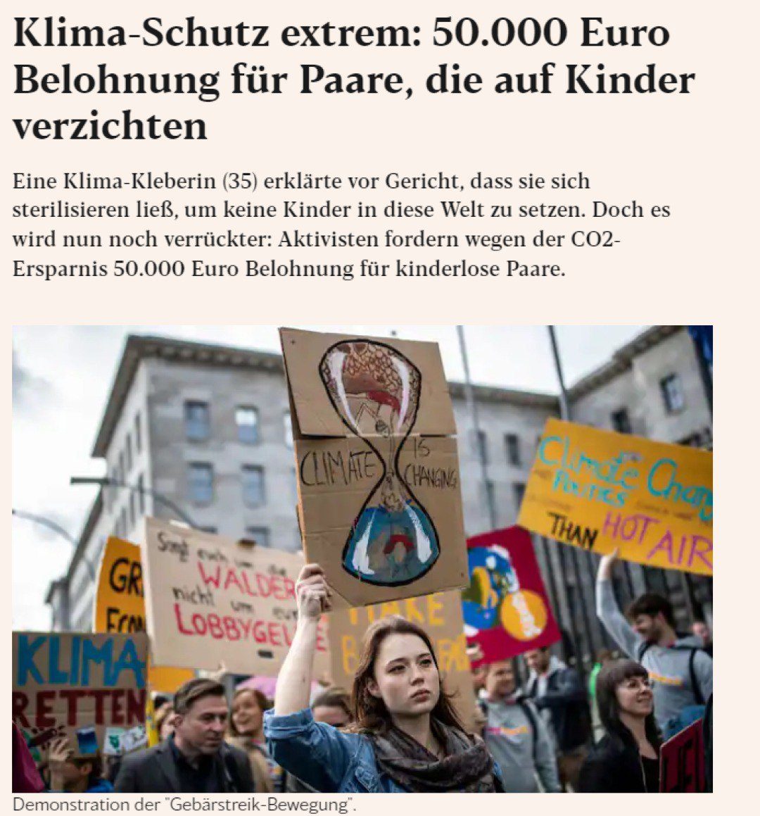 Non è un caso isolato: il rifiuto dei bambini “a favore del clima” sta prendendo piede in un movimento diretto dall’attivista Verena Brunschweiger, a cui si uniscono anche uomini che si sottopongono volontariamente alla vasectomia.