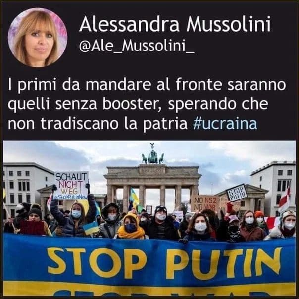 Alessandra Mussolini , interamente posseduta dal delirio bellicista, ha voluto esprimere in un solo twitter il suo odio parimenti delirante per gli altri italiani. Dategli appena un permesso dell’autorità, e gli italiani si mettono ad uccidere altri italiani. La vera, sola guerra che facciamo volentieri è la guerra civile.
