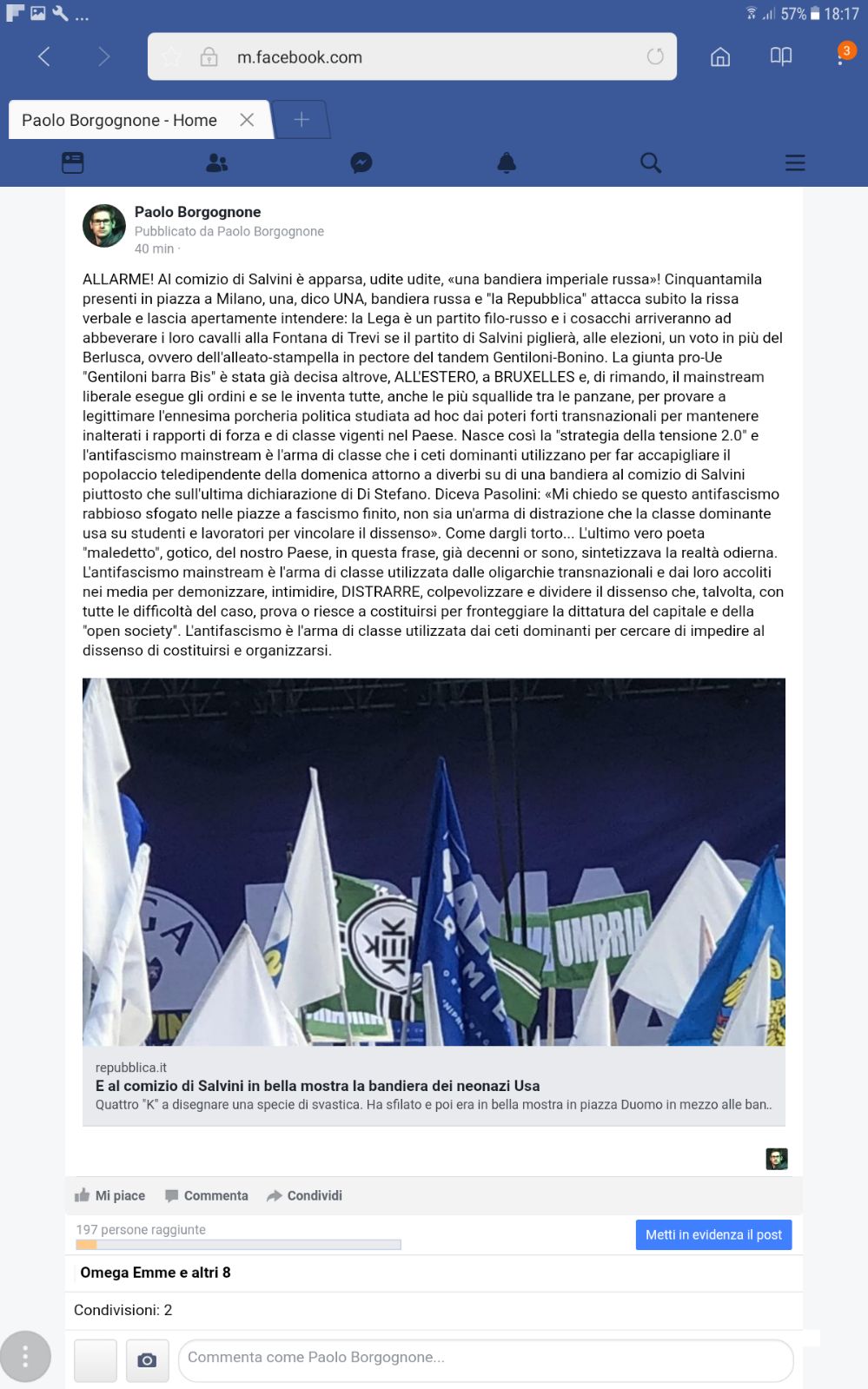 LA REPUBBLICA HA L’ ALLUCINAZIONE ANTIFASCISTA Maurizio Blondet 25 Febbraio 2018 5 Tra l’altro quella “incriminata” da La Repubblica non è nemmeno una bandiera “neonazista”, ma un fake, la bandiera di uno stao fittizio, portata al comizio di Salvini apposta da alcuni militanti per trarre in inganno i media perbenisti.
