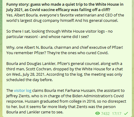 A proposito di “è tutta la stessa cosca bio-criminale”, Bourla il capo di Pfizer andò segretamente alla Casa Bianca a parlare con Biden nel luglio 2021…