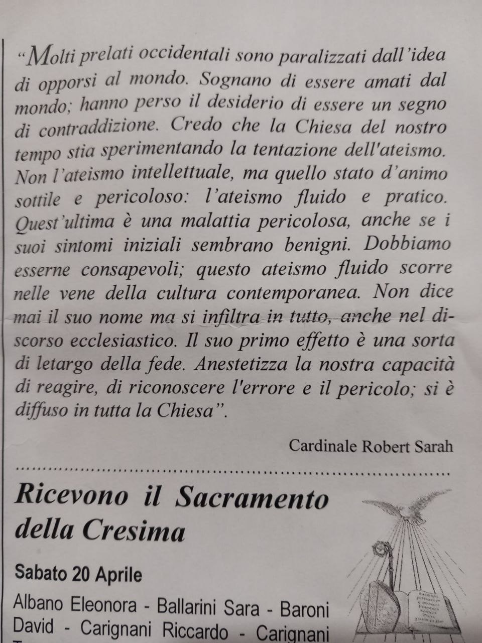 Bisognerebbe restituire ai giovani il timor Di Dio, il terrore della pena eterna e il valore salvifico ed eroico della Croce; cosa niente affatto disponibile, visto che la stessa Chiesa non lo proclama più..