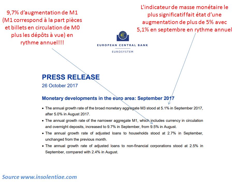 Ma quale crescita dell’1,8 e o del 2,2! L’Europa sta calando del 3,2 % almeno. Ciò, secondo l’economista Charles Sannat. Ha letto un documento della banca centrale europea che vanta di aver aumentato – a forza di “stampa” – la massa monetaria M1 (le banconote circolanti e i depositi a vista) del 9% all’anno, e la massa monetaria M3 (oltre M1, tutto ciò che la speculazione crede “monetabile”) del 5% annuo.