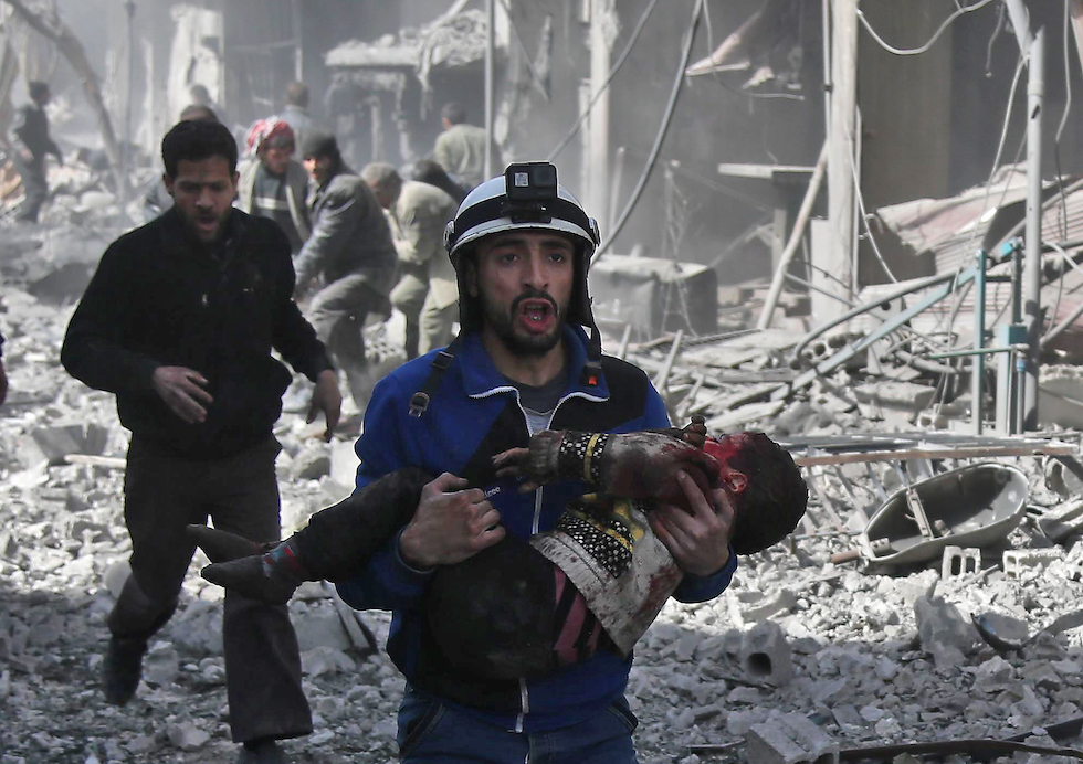 Un casco bianco  salva il bambino di prammatica a Goutha Est   nei bombardamenti il 19 febbraio