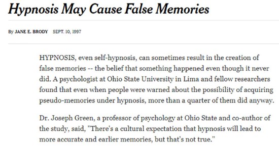 Cosa possibile, d’accordo. Ma in quel caso si è parlato appunto di False Memory Syndrome. Un effetto collaterale contro cui metteva in guardia già nel 1997 un articolo del New York Times. Dove si dice che “anche l’auto-ipnosi” può generare ricordi falsi.