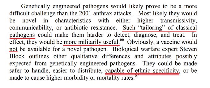 O uno studio della British Medical Association (BMA), Biotechnology, Weapons and Humanity II, che nel 2002 avvertiva: e la costruzione di armi genetiche “si sta avvicinando alla realtà”. Studio che riprendeva il convegno internazionale tenutosi a Montreux in Svizzera nel settembre 2002, dove virologi e genetisti parlarono a ragion veduta delle bio-armi fattibili, i cui atti sono consultabili: