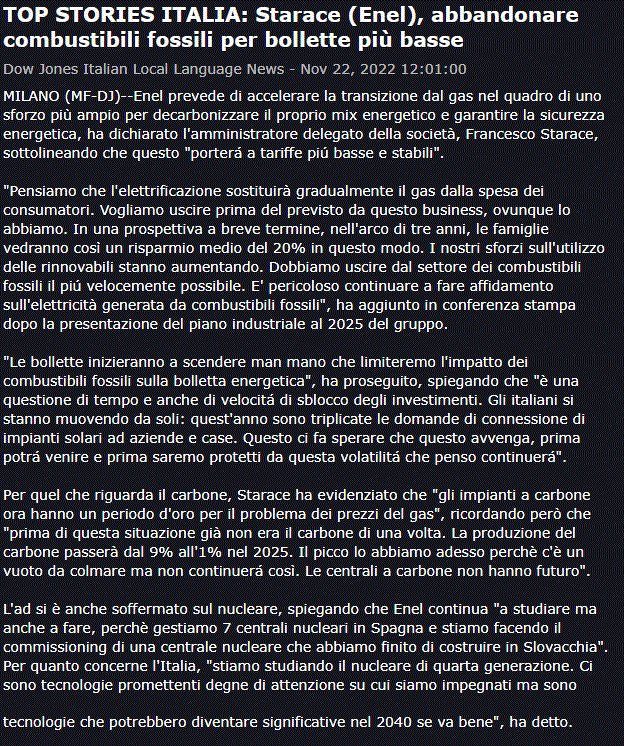 il capo di ENEL (che ha tuttora lo stato come azionista) dichiara: "chiudiamo tutte le centrali a carbone, usciamo dal gas ovunque prima del previsto, nucleare forse nel 2040, solo solare e eolico in Italia"