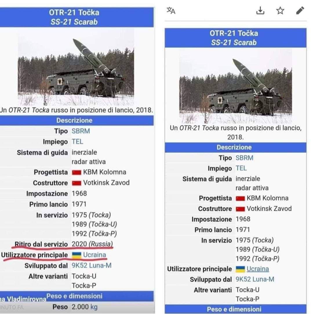La correzione immediata che Wikipedia ha fatto sulla voce riferita al missile usato – ha cancellato il fatto che la Russia non lo usa più dal 2020, testimonia qualcosa di peggio della malafede: la complicità attiva e il favoreggiamento nelle atrocità che la truppa di Zelensky compie impunemente.