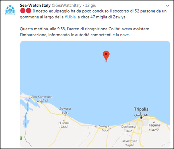 Roma, 18 giu – In seguito al dissequestro tempestivo deciso dalla Procura di Agrigento, la nave battente bandiera olandese Sea Watch 3 della Ong tedesca, Sea Watch, è ripartita veloce da Licata verso la zona “ricerca e salvataggio” della Libia. Il 12 giugno, appena giunta in acque di competenza della Guardia Costiera libica, Sea Watch riceve una segnalazione dall’aereo da pattugliamento Colibrì di Pilotes Volontaires, in merito ad un gommone casualmente prossimo alla sua posizione. Disattivato il transponder (Sea Watch 3 è dotata di stazione AIS trasmettente), la nave dei “pirati umanitari” fa rotta verso le coordinate suggerite e, senza nemmeno informare il Centro di Coordinamento di Tripoli (regolarmente registrato presso l’Organizzazione Marittima Internazionale delle Nazioni Unite), trasborda 53 migranti.