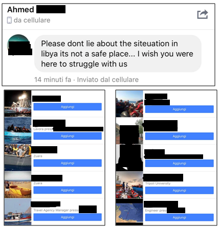Piccola nota conclusiva personale: il mio impegno, riguardo alla battaglia per contrastare il business dei trafficanti di esseri umani e le morti in mare connesse, è giunto forte e chiaro anche in Libia, con un messaggio intimidatorio arrivatomi direttamente in posta privata su Facebook. È bastata una semplice occhiata agli “amici” di Ahmed, per capire chi fosse in realtà.