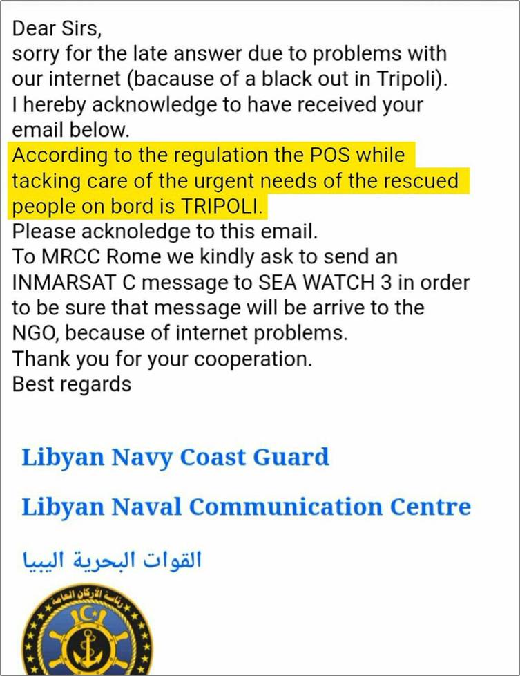 Come evidenziato nel post, la Ong tedesca chiede un “porto sicuro” di sbarco anche al Centro di Coordinamento libico. Quando Tripoli risponde positivamente alla richiesta, concedendo appunto un porto ai 53 migranti, viene svelata tutta l’ipocrisia di Sea Watch. E il suo castello di fandonie crolla inesorabilmente.