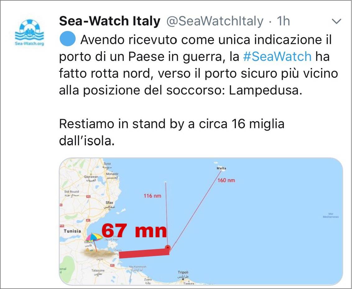La Ong tedesca nega la possibilità dello sbarco del “prezioso carico di esseri umani” (cit. Roberto Saviano), e fa rotta senza indugi verso Lampedusa, non prendendo nemmeno in considerazione la Tunisia, nonostante sia già stata definita più volte “porto sicuro” da Vincent Cochetel dell’Agenzia delle Nazioni Unite per i rifugiati (UNHCR). Ricordiamo anche che Zarzis, a sole 67 miglia nautiche dal luogo del trasbordo, è una nota località balneare tunisina, visitata ogni anno da migliaia di turisti italiani ed europei.