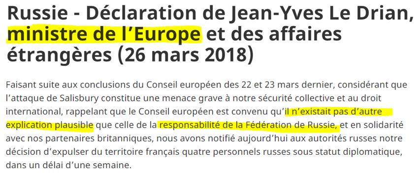 Jean-Yves Le Drian, ministro degli Esteri di Parigi : “… Convenuto che non esisteva altra spiegazione plausibile che la responsabilità della federazione russa”.