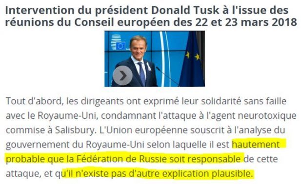 Donald Tusk: “E’ altamente probabile che la Federazione Russa sia responsabile di questo attacco [il supporto avvelenamento della spia Skripal] e non c’è altra spiegazione possibile”.
