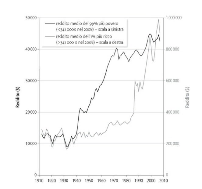 Esattamente dopo la caduta del keynesismo (1973) e l’affermarsi incontrastato del neoliberismo, si arresta la crescita del reddito del 99% della popolazione più povera e inizia l’inarrestabile crescita dell’1% più ricco. Fino ad arrivare al paradosso di oggi.