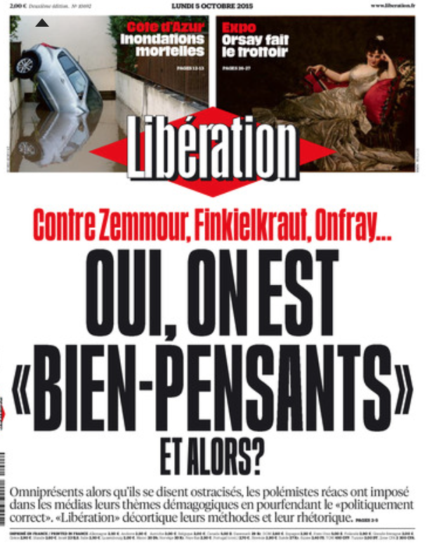 Inaudito. Il giornale di tutte le sinistre radical chic, fra trotzkismo e anarchismo, fra sessantottismo e trasgressione (ma di proprietà Rotschild) , si dichiara “benpensante”. Pensate solo se apparisse un titolo del genere, poniamo, sul nostro Manifesto. Siamo qui ad un rovesciamento comico di posizioni: la gauche frou frou si schiera dalla parte di ciò che è sensato, moderato ed assennato contro quei sovversivi anticonformisti di reazionari senza rispetto per i tabù della sinistra. Il punto è che questi spaccatutto, quando vanno in tv a fare a pezzi il pensiero unico, piacciono al pubblico – il pubblico che al 25 per cento voterà Marine Le Pen. Da qui l’accusa da parte di Libération agli intellettuali non-conformisti di “fare il gioco del Front National”, credendo con ciò di squalificarli. Il che ha indotto Régis Debray, un grande vecchio della cultura, non certo di destra, a dichiararsi disgustato dal fatto di “screditare moralmente un avversario intellettuale col piccolo gioco stalinista o maccarthista di ‘fare il gioco di’”.