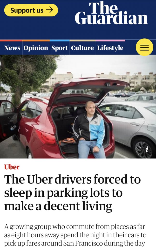 Mentre molti gli autisti di Uber devono dormire nelle aree di parcheggio, perché abitano in sobborghi lontani ore di auto, e se tornassero a casa perderebbero i clienti in città. Evidentemente per molti, fare l’autista di Uber non è un lavoretto occasionale part-time, ma l’unico disponibile.