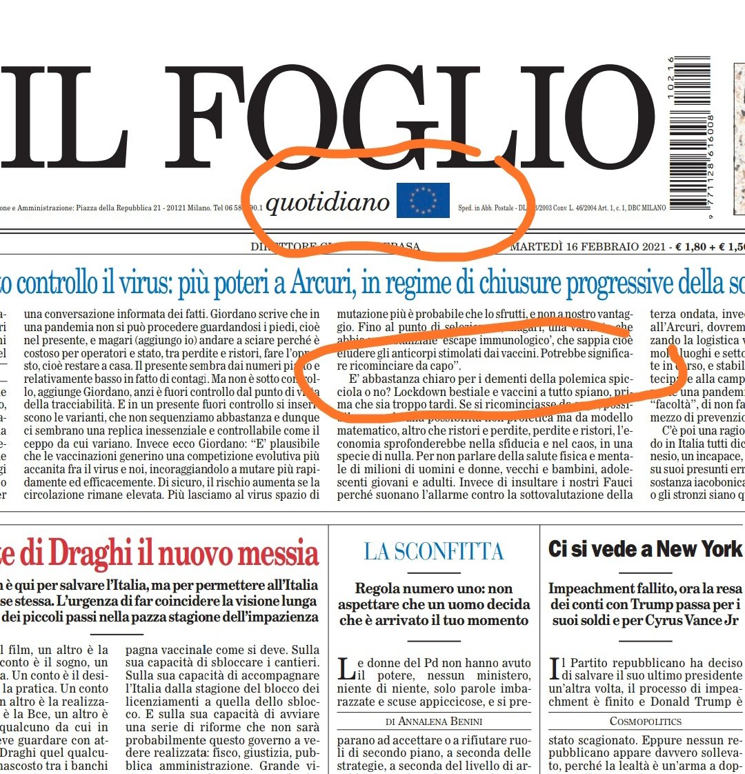 Alle due voci s’è unita (poteva mancare?) quella de Il Foglio, che nella comunità dei signori del discorso copre la frenesia delirante, l’estremismo chutzpah : esige Più potere ad Arcuri, #lockdown bestiale e vaccini a tutto spiano, prima che sia troppo tardi!”
