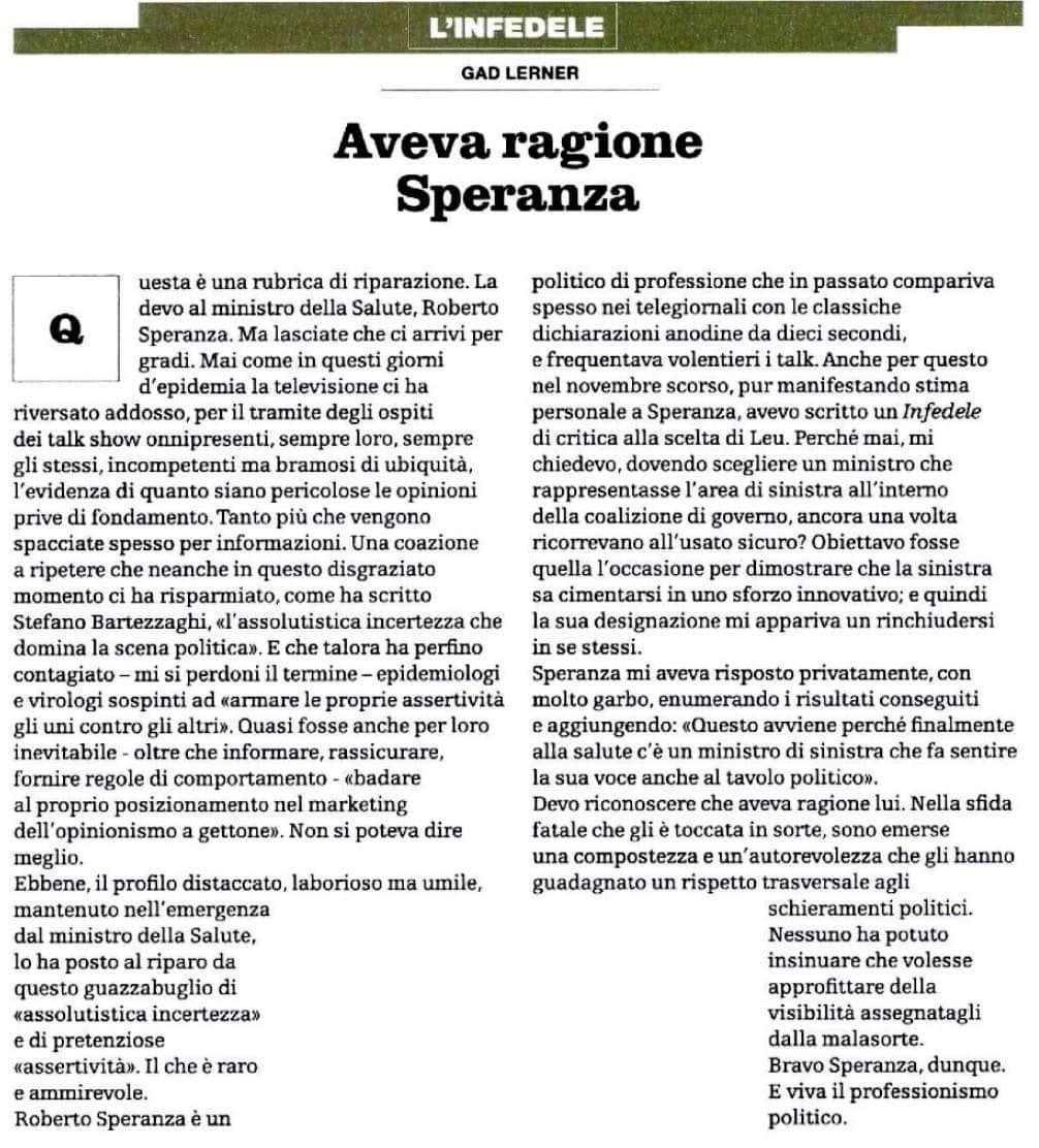 Per contro, ho trovato – inquietante – che due personalità ebraiche note e rilevanti nell’agorà, dirigenti mediatici, signori del discorso, hanno costantemente elogiato Speranza , ne hanno promosso la figura di politico con toni che superano l’adulazione.